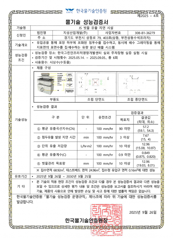 지식재산권 CLEAN WATER · CLEAN WORLD 인증서 한국물기술인증원 성능검증서 페이지 정보 작성자 최고관리자 댓글 0건 조회 44회 작성일 25-09-29 08:51 목록 본문 다음글IoT 센서를 기반으로 한 유량 분산 배출 기능의 지능형 빗물 배제 및 분산 배출 시스템 25.06.12